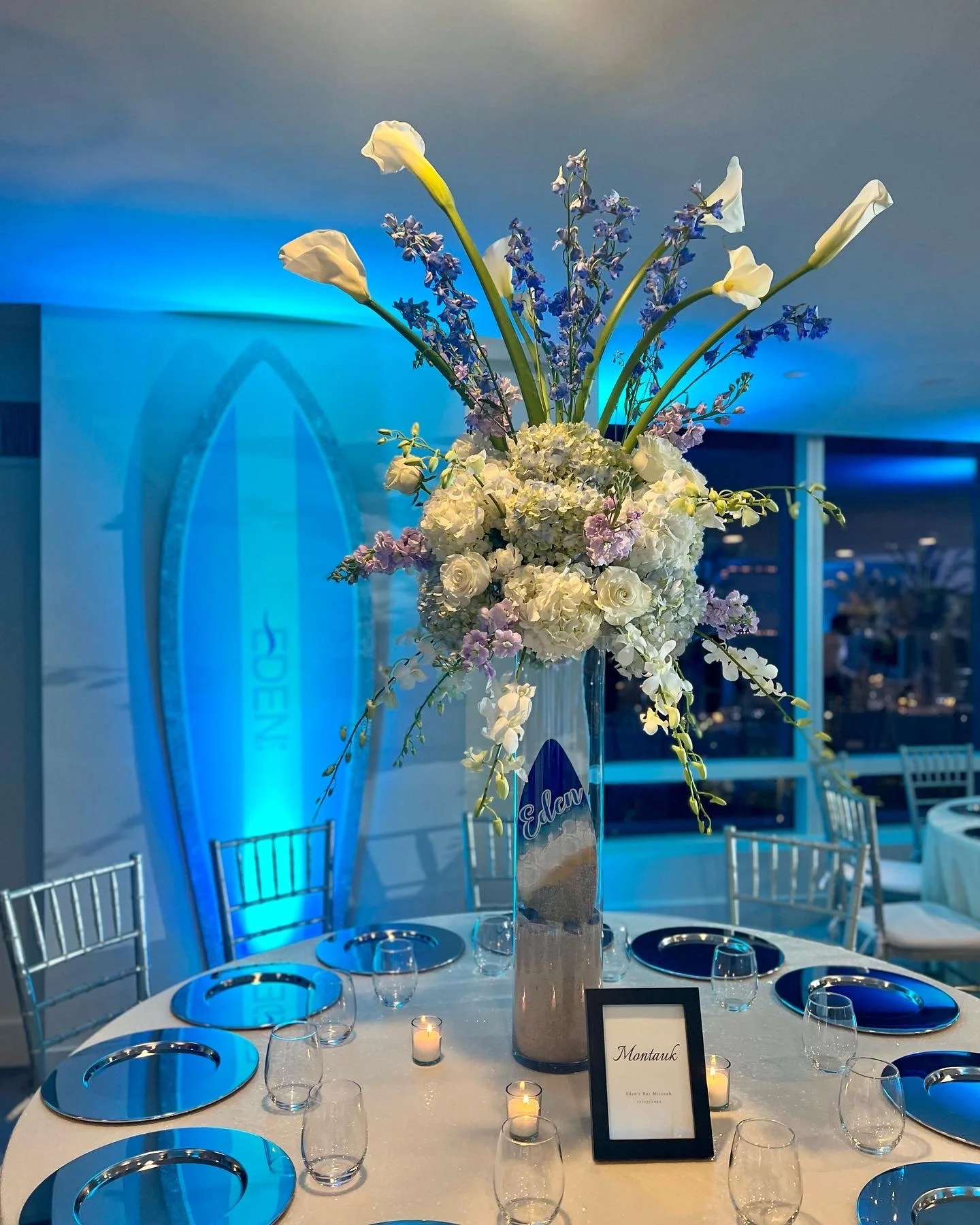 Elegant event table decorated with a tall floral centerpiece consisting of white roses, hydrangeas, and calla lilies, surrounded by 8 place settings with silver-rimmed blue plates, clear glasses, and lit candles. The background features a surfboard w